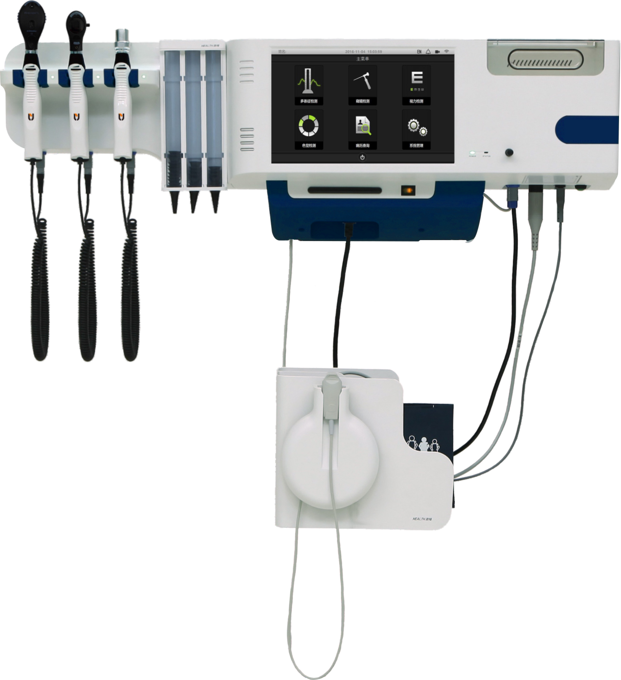 检查项目≥15项,其中包含心率、呼吸率、心电波形、呼吸波形、脉搏波、脉率、脉搏氧饱和度、无创血压、体温、血糖、尿酸、胆固醇、视力检查、色觉检查、眼底检查、耳膜及耳道检查、喉部检查等。